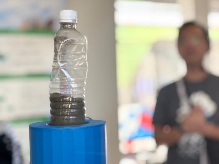 二酸化炭素を吸収するコンクリートの実験では、コンクリートの素材となる路盤材をあらかじめ入れてあるペットボトルに二酸化炭素を注入すると、コンクリート素材はどんどん二酸化炭素を吸収し、ペットボトルは押しつぶされるように凹みました。