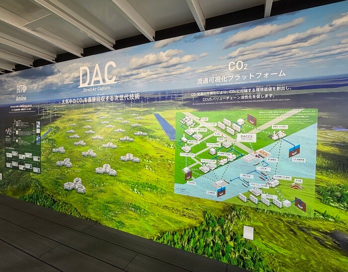 RITE未来の森では、RITEが研究開発に取り組む大気中の二酸化炭素を直接回収する技術(DAC)や、地球温暖化の最大原因とされる二酸化炭素を分離回収して地中に貯留する技術(CCS)のほか、大学や企業の取り組みも含め、二酸化炭素の排出量を削減する未来を展示しています。