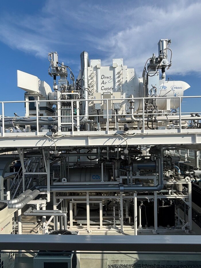 2階にあがって目の前に現れるのは巨大なDACという装置、大気中の二酸化炭素を回収し、e-メタンとして利用します。e-メタンは、都市ガスの原料となり、世界中で注目されている、地球温暖化対策革新的な技術です。