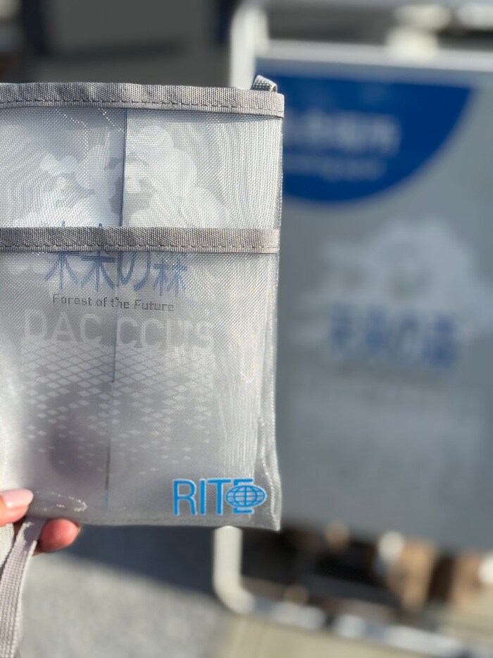 一般来場者は立入禁止の管理エリアにあるパビリオンへは、無料の専用バスで向かいます。途中、通常は通ることのできない管理エリアを、バスの中から見学しながら到着します。「RITE未来の森見学ツアー」参加者は、ガイドブックとサコッシュがもらえます。ツアー中は、最初のシアター以外の撮影は自由、初めて目にする施設での見学で私を含めて参加された人たちも胸の高まりからワクワクされる様子が伝わります。