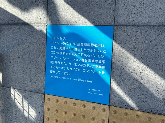 見学の際に歩いていたコンクリートも、廃棄物から抽出した二酸化炭素を原料とした、カーボンネガティブを実現するカーボンリサイクル・コンクリートを使用!何気なく歩いていたコンクリートまで地球に優しい原料で作られるとは、未来への期待が高まります。