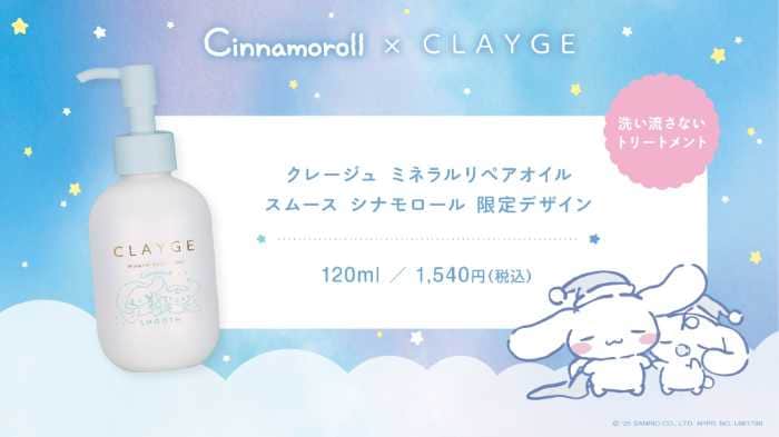 人気クレイケアブランド「CLAYGE(クレージュ)」とサンリオの大人気キャラクター「シナモロール」が夢のコラボを実現しました。数量限定で登場するのは、ブランド定番人気の「シャンプー&トリートメント SR」と「ミネラルリペアオイル スムース」の限定デザイン。シナモロールとお友だち・みるくが描かれた特別仕様で、毎日のバスタイムやヘアケアをもっと楽しく彩ります。2025年10月10日(金)から全国のバラエティショップ・一部ドラッグストアで販売される注目コレクションです。