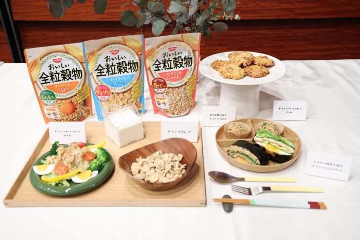 会場には、「オートミールフレーク」「ロコモコ風照り焼きオートミールごはんサンド」「オートミールロールドオーツクッキー」「オートミールロールドオーツサラダ」「鮭と大葉の混ぜオートミールごはん」の全5品を用意。関口氏は、「無理に食事を変えるのではなく、いつもの食事をベースに、『おいしい全粒穀物』シリーズをちょい足ししたり、置き換えたりすることで、手軽に食物繊維を摂ることができます」と説明した。