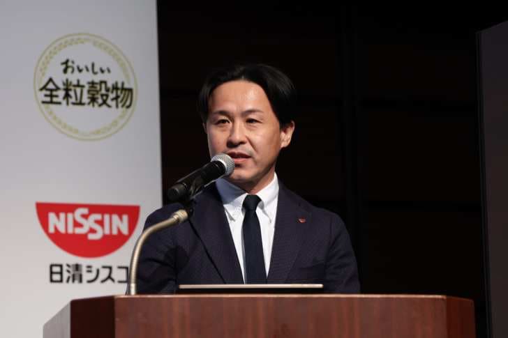 また、記者発表会では、日清シスコ株式会社 マーケティング部 第3グループ ブランドマネージャー 篠原鎮麻氏が、新商品のプレゼンテーションを実施。食の選択軸として「健康・コスパ・手軽」という要素が重視され、中でも「健康」が注目されている世相の中、同社が長年、さまざまな穀物を使った菓子・シリアルを開発してきたことから、食物繊維を豊富に含む「全粒穀物」を活用して、食物繊維をもっと美味しく、手軽に摂れることを目指して、「おいしい全粒穀物」の発売に至ったと説明した。