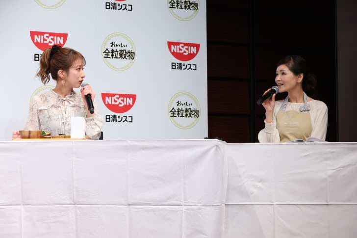 イベントには辻󠄀のほか、管理栄養士・料理研究家の関口絢子氏が登壇。食物繊維について辻󠄀は、「腸の動きが大事であるということは幼い時から知っていたので、食物繊維をなるべく摂るよう10代の時から意識しているのですが、自分が今どれくらいの必要量を摂れているかはわかってはいないです」と告白。「今日は学んで帰りたいです!」と意気込みを見せた。