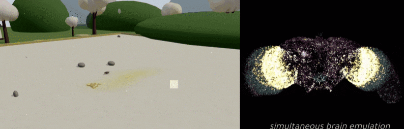 すると仮想空間のハエは実際に動き出し、歩いたり、身づくろいをしたり、食べたりという行動をとるようになります。