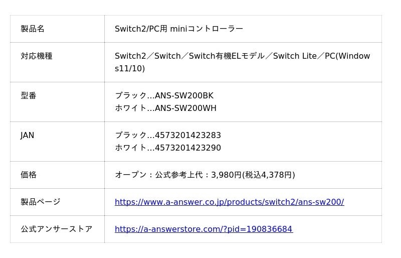 ゲーム周辺機器・トレカサプライメーカーのアンサー株式会社(本社:大阪府大阪市中央区、代表取締役社長:有村 勇志)は、お子様や女性で手の小さな方に最適なコンパクトサイズの有線/無線両対応「Switch2/PC用 miniコントローラー」を、公式アンサーストア、全国の家電量販店、小売店、専門店、インターネットショップ等にて順次販売を開始することをお知らせいたします。