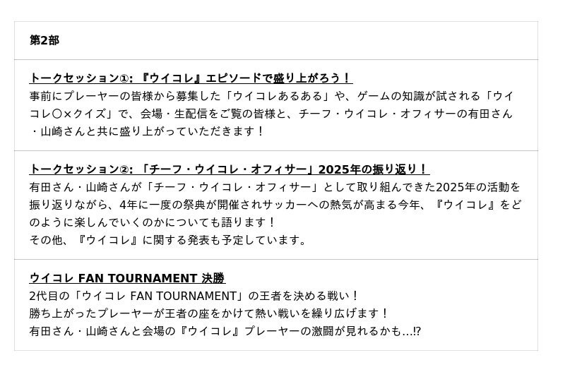 当日は、事前に募集した「ウイコレあるある」や、ゲームへの知識が試される「ウイコレ〇×クイズ」、2025年の「チーフ・ウイコレ・オフィサー」としての活動を振り返るトークセッションに加え、2代目の「ウイコレ FAN TOURNAMENT」王者の座をかけた決勝の様子も生配信します。