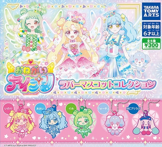 『おねがいアイプリ』のアニメ・アミューズメントゲームのスタートに合わせて、ガチャ(R) (カプセルトイ)から『おねがいアイプリ ラバーマスコットコレクション』<希望小売価格1回300円/税込>が登場します。4月より全国のカプセル自販機(ガチャマシン)で発売されます。