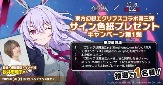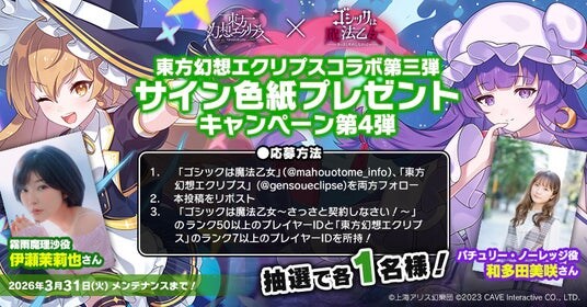 株式会社ケイブ(本社:東京都目黒区、代表取締役社長:高橋祐希、証券コード:3760)が配信中のシューティングゲームアプリ『ゴシックは魔法乙女~さっさと契約しなさい!~』(『ごまおつ』)におきまして、同社が提供するシューティングゲーム『東方幻想エクリプス』とのコラボイベント『波長を繋ぐ 幻想の魔門公』後篇を本日3月19日(木)より開始いたしました。