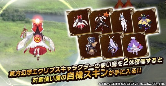 イベント開催期間中に東方幻想エクリプスの特定のキャラクター使い魔を2体獲得すると、対象キャラクターの自機スキンを手に入れることができます。