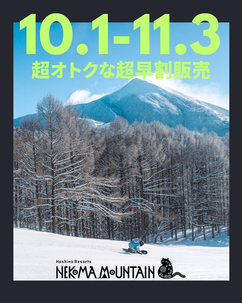 雄大な磐梯山と猪苗代湖を望み、開放的な滑りを楽しめる南エリア(旧アルツ磐梯)と、標高が高く軽い雪が降り積もり、北向きの斜面で春までロングシーズン楽しめる北エリア(旧猫魔スキー場)に分かれている、国内最大級の広さを誇るスノーリゾート。1日券は10月1日から販売がスタートし、超早割価格は11月3日まで購入できる。