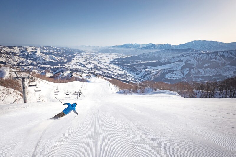 越後湯沢駅からは無料シャトルバスで約3分程度のホテル&スキーリゾート「NASPAスキーガーデン」。今では珍しいスキー専用のゲレンデは、8コースを備え、ビギナーでも山頂から楽しめる全長2.2kmのロングコースや急斜面、モーグルバーン、非圧雪エリア、パークなど、中上級者向けのコースまで、あらゆるスキーヤーに対応している。