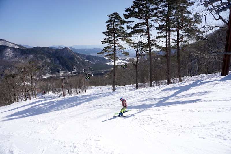 フラットな中緩斜面が多いスキー場。青木湖へ向かって滑り込むグルーミングバーンのロケーションが密かに人気を呼んでいる。駐車場からゲレンデへ向かう途中に、踏切を渡ってスキー場へ行くという非日常感も楽しい。