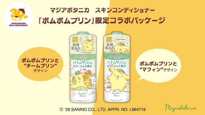 今回発売されるのは、「マジアボタニカ スキンコンディショナー」のポムポムプリン限定コラボパッケージ2種類。
