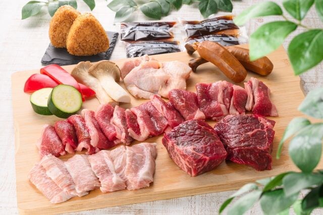 内容:国産牛カルビ100g、国産牛モモ100g、鶏50g、豚トロ50g、ソーセージ、焼きおにぎり、焼き野菜、焼き肉のたれ