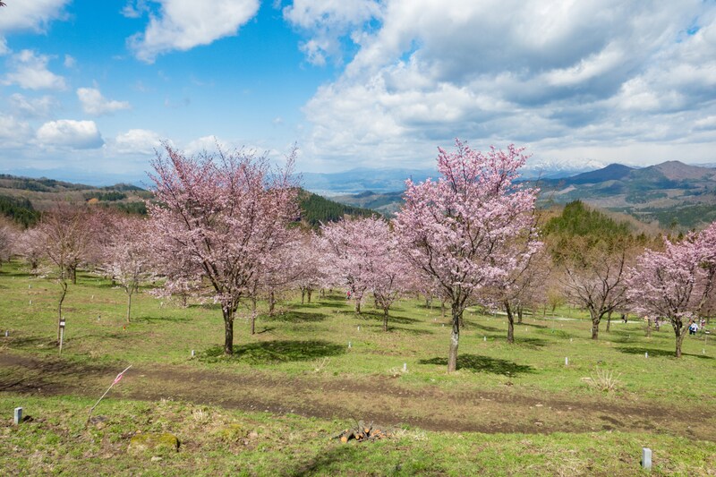約3,000本ものオオヤマザクラが咲き誇る、圧巻の桜の名所。残雪と桜のコントラストが美しい、写真映えするスポットとしても人気。