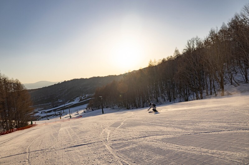 夜間の冷え込みで適度に締まった最高のコンディションのゲレンデを朝一番に滑走できる。日の出が早まる春の朝だけの、特別な時間だ。