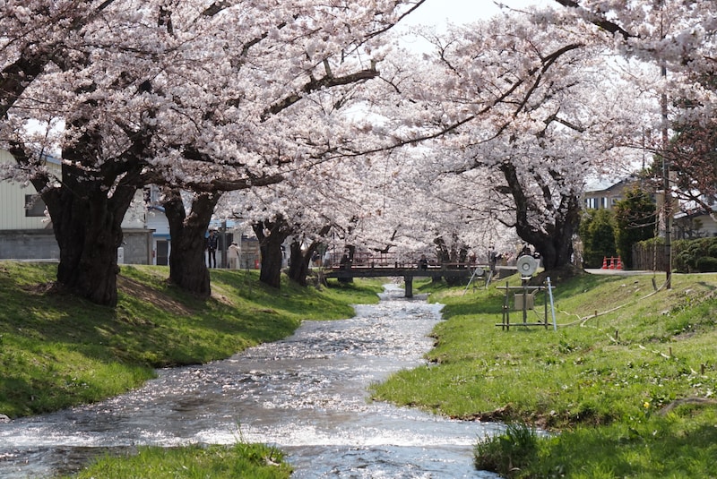 川の両岸に約1kmにわたって約200本のソメイヨシノが咲き、桜のトンネルを作り出す。川のせせらぎを聞きながら、のんびりと散策するのに最適。