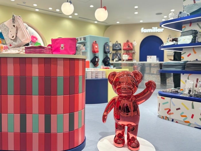 店頭では、赤いメタリックのファミちゃんがお出迎えしてくれます。店内のインテリアやファミリアチェックともリンクするような明るいカラーはお買い物の気持ちもあがります。