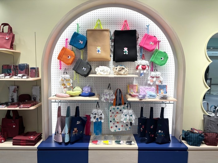 レジのお隣にはクマの形をした鏡が。ポップなイエローの壁紙は、お気に入りのアイテムと一緒にフォトスポットとしても利用いただけるスペースになっております。