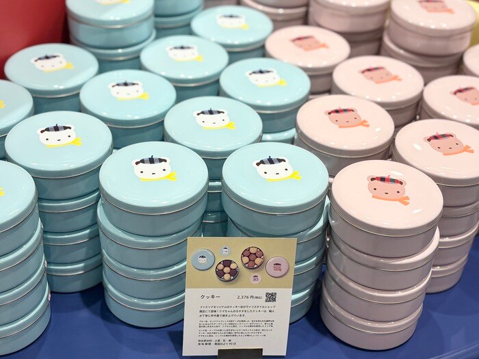 ライフスタイルショップ限定の「ファミリアオリジナルのクッキー缶」。ブルーの缶はチーズとココア、ピンクの缶はメープルキャラメルとプレーンで、異なる2種類のクッキーが販売されています。
