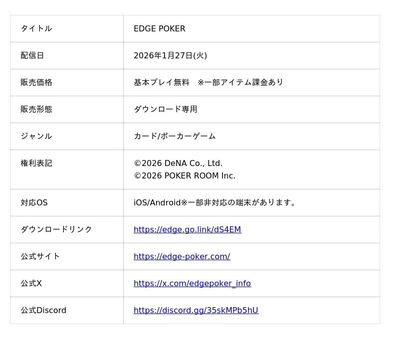 『EDGE POKER』は、日本のポーカーブームを牽引するプロポーカープレイヤー「世界のヨコサワ」が率いる株式会社POKER ROOMと協業し、2026年1月27日に配信開始したポーカーゲームアプリです。数千万に及ぶシチュエーションを用いて学習したオリジナルポーカーAI「EDGE AI」を搭載し、初心者でも迷わない「AIガイド」などにより、誰でも本格的なポーカー体験を楽しむことができます。
