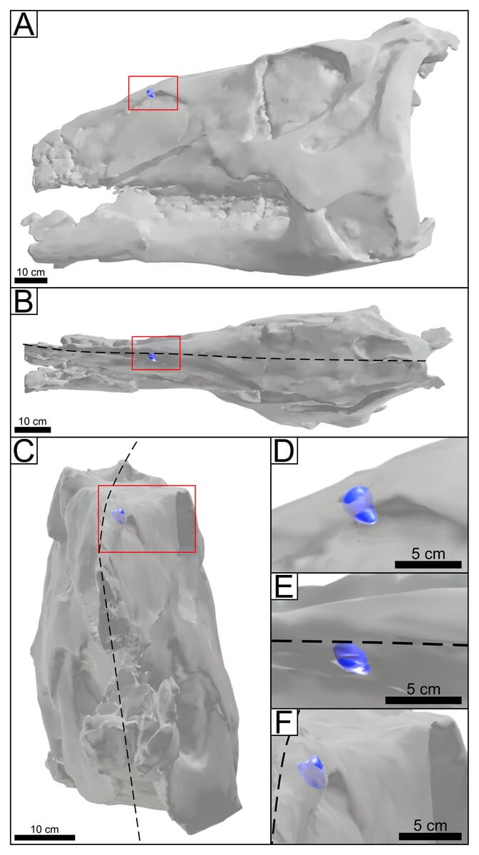 さらに、頭骨にはこの歯以外にも複数の噛み跡が確認されており、攻撃が一度きりではなかったことがうかがえます。