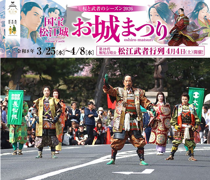 国宝に指定されてから10周年を迎えた松江城で、2026年3月25日から4月8日まで「お城まつり」が開催される。桜の見頃に合わせて毎年行われるこの春の風物詩は、現存12天守のひとつという歴史的な舞台と、約200本のソメイヨシノが一体となる島根県随一の花見イベント。