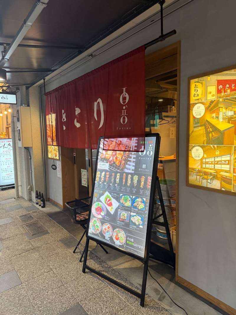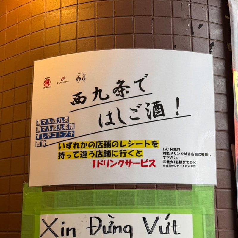 「屋台居酒屋 大阪 満マル」西九条店、「すしやコトブキ」、「野菜串と焼鳥 とりね」(酉音)と続いており、道路向かいの「屋台居酒屋 大阪 満マル」西九条店とあわせて4店舗で「はしご酒」のドリンクサービスを行っているようである。