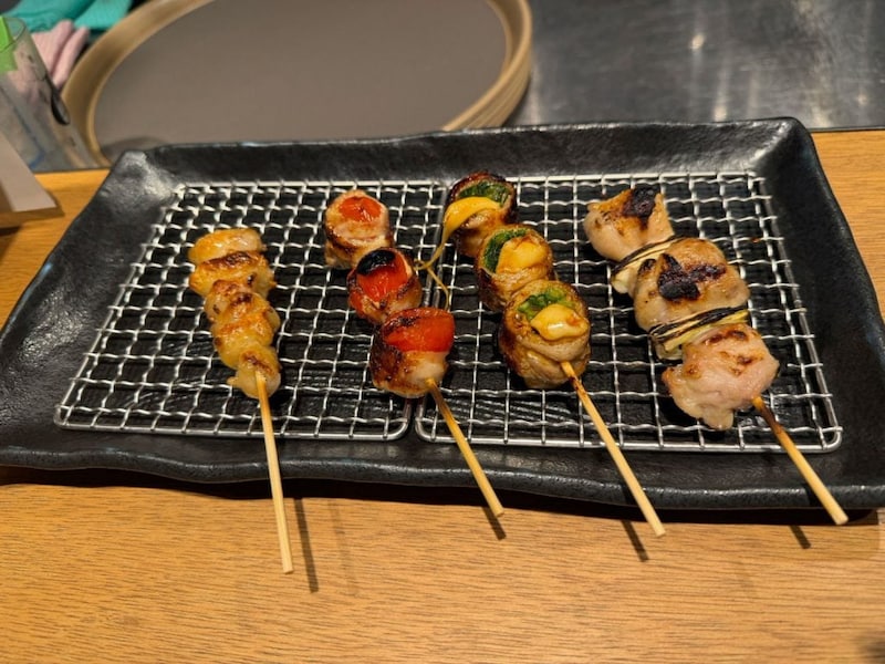 肝やハツなどの焼鳥と、野菜を巻いた串。