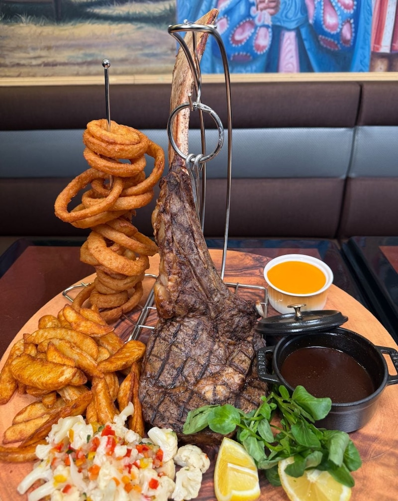 インパクト抜群のスペシャルプレートは4名様用。メインのまるでトマホークな大型ステーキ、お肉の部分は800gはあるとのこと。