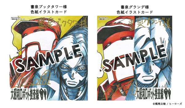書泉ブックタワー様、書泉グランデ様にて「『大昭和ロボット捜査線』発売記念フェア」を開催いたします。色紙の展示や横尾公敏直筆サイン入り複製原画の抽選プレゼントに加え、購入特典として色紙イラストカードを配布します。