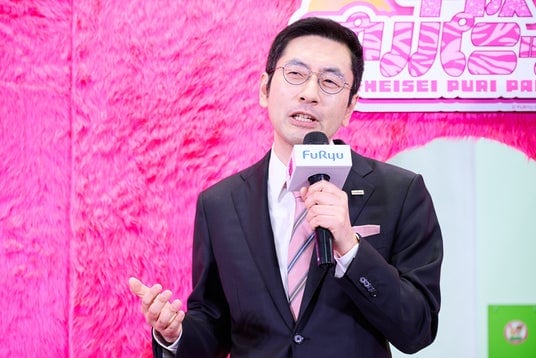 フリュー社長 榎本雅仁、オープニングの挨拶にて「『ウチらのプリ展』では、プリ30年の歴史の中でもずっと本質的な価値であり続けている『やっぱりプリって面白くて、めっちゃ楽しい!』を感じていただきたい」と語る。