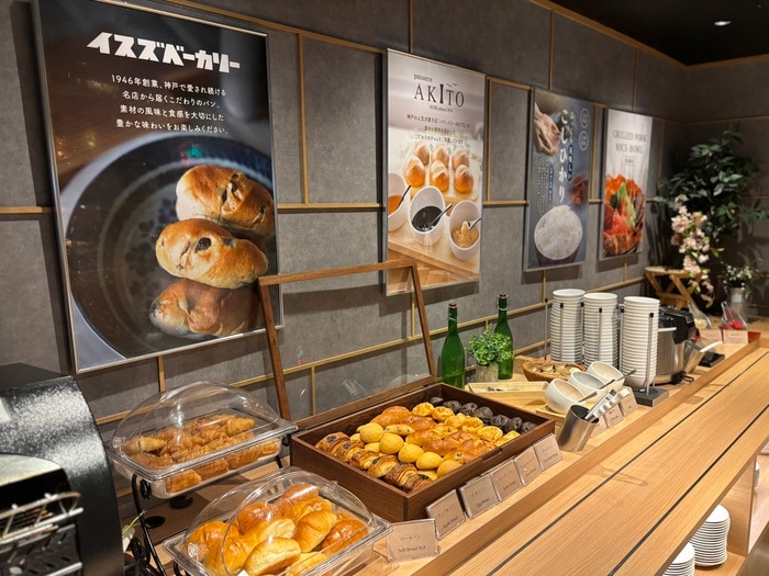 和〜洋と豊富な朝食メニューは、フレンチトーストに、ハムやベーコン、神戸の有名店イスズベーカリーのパンにパティスリーアキトのミルクジャムなど、バラエティ豊かなメニュー。