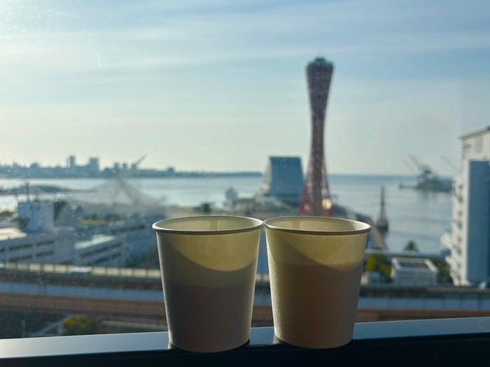 ホテル最上階13階「HIDE OUT」にて朝のコーヒータイム、カウンターにて無料のコーヒーやソフトドリンクが用意されています。神戸ポートタワーの景観を望む圧巻のパノラマを独り占めできる特等席。