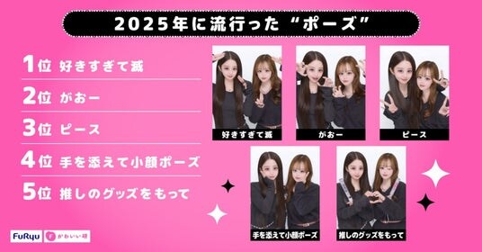 1位に選ばれたのは日本の男性5人グループ“M!LK”が結成10周年となる昨年の締めくくりにリリースした「好きすぎて滅!」の決めポーズ。「好きすぎて自分が滅んでしまいそう」という爆発的な愛をキャッチーに歌った曲で、推し活が日常の一部となったZ世代の心理とマッチしました。2025年のフリュートレンド大賞流行語部門でも“○○すぎて死ぬ”という強調スラングが2位に入っており、「好きすぎて滅!」はその最新版と言えそうです。TikTokでは振り付けを真似する人が続出してバズり、“M!LK”が初めて昨年の紅白歌合戦に出場するなど、大きな話題となった影響がプリにも届いた結果となりました。また5位には「推しのグッズをもって」がランクインしており、プリの楽しみ方でも推し活が主軸になっていることが伺えます。その他2位~4位には、平成時代からの定番ポーズ「がおー」「ピース」「小顔ポーズ」がランクインしました。