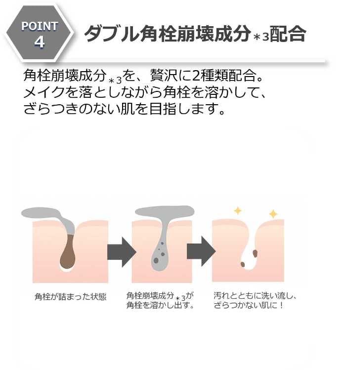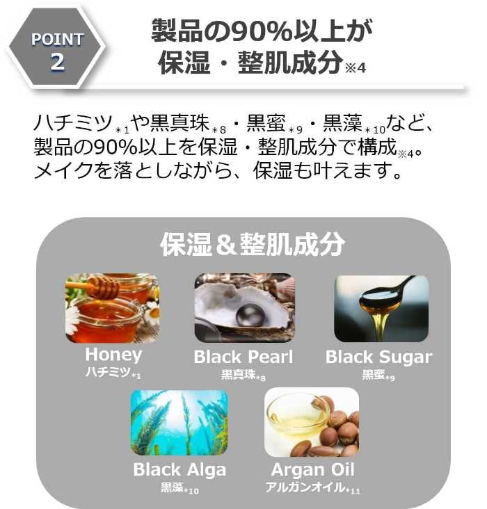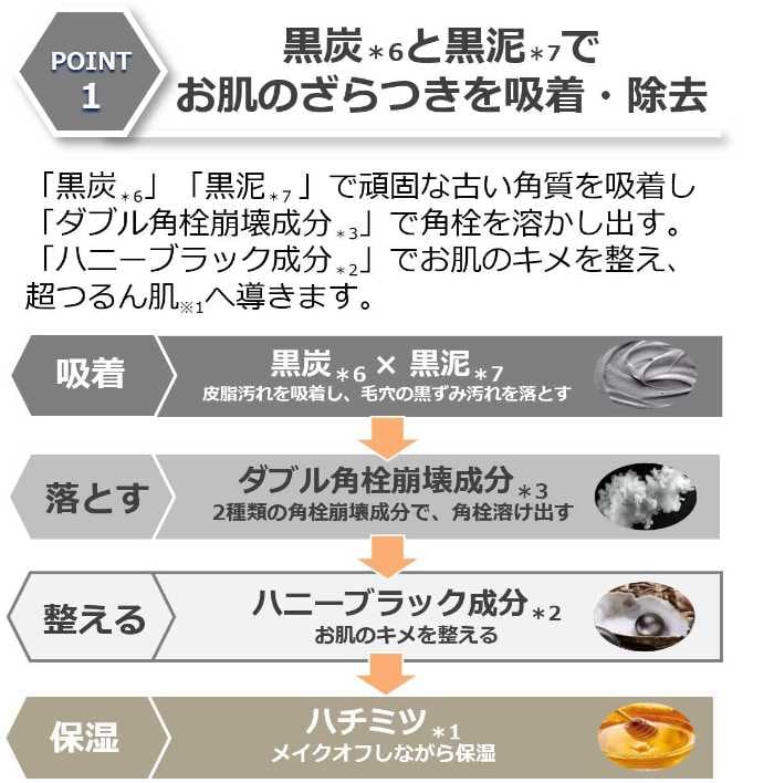 ハニーブラック成分*2に加え、ダブル角栓崩壊成分*3を配合し、毛穴汚れをしっかりオフ。さらに炭*6や海シルト*7など“黒の成分”により、つるんとした肌印象へ導きます。
