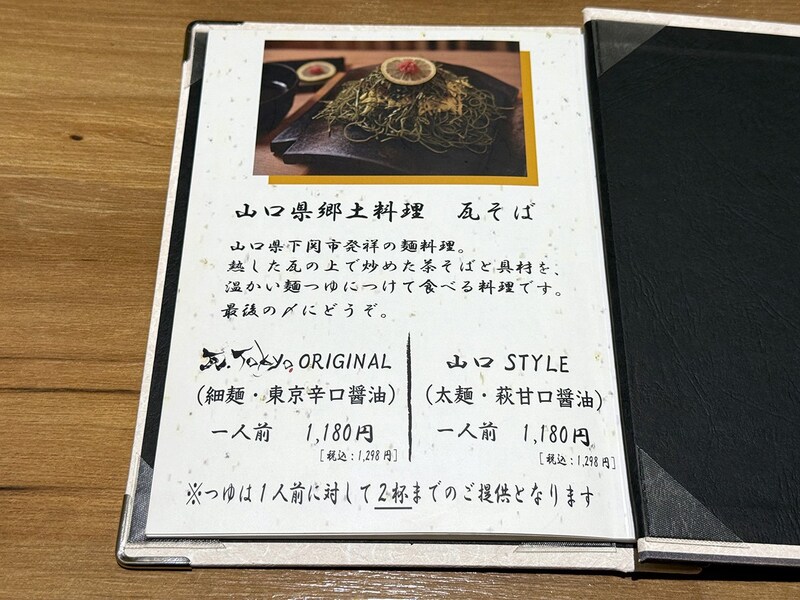 「瓦.TOKYO」は山口県の郷土料理と地酒の店というコンセプトのようですが、メニューを見てみると……ありました、ありました! 瓦そばがありましたとも!
