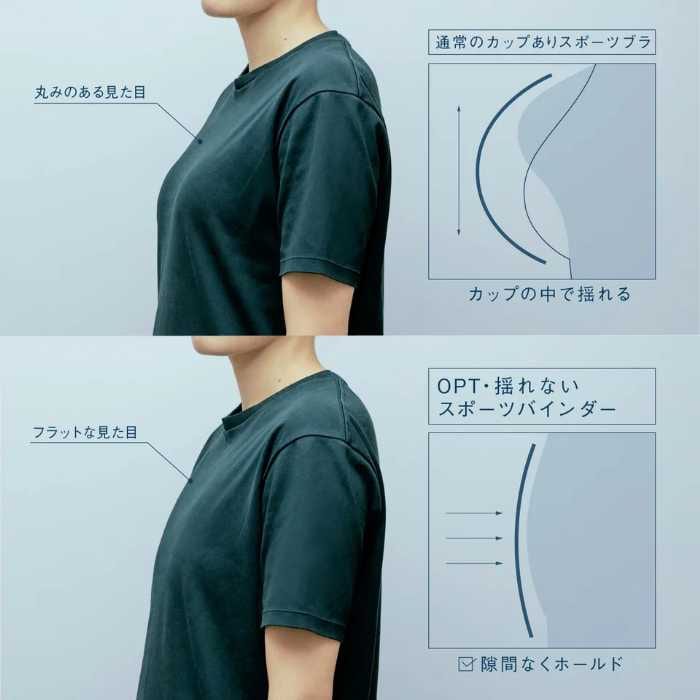 「ゆれないスポーツバインダー」は、従来のスポーツブラで一般的だったカップ構造をあえてなくし、独自の「フラットパッド」を採用。