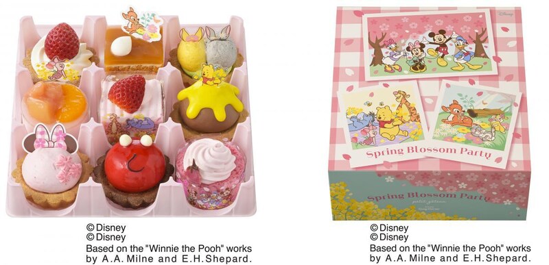 「ミッキー&ミニー」に、「くまのプーさん」と「バンビ」の仲間たちがお花見を楽しんでいるシーンをイメージしてデザインされたプチケーキが9種類セットになっています。