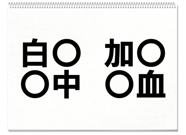 【答】 熱それぞれ「白熱」「加熱」「熱中」「熱血」となります。