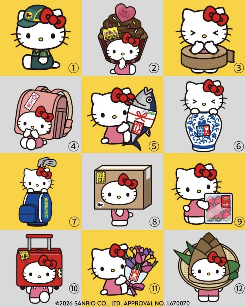 ステッカーのデザインは12種類。セールスドライバーの制服姿に、段ボールや花瓶、ゴルフバッグなど様々な贈り物の中から顔を出す姿など、ここでしか見られない個性豊かなハローキティが登場しています。