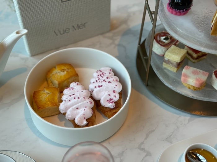 プレーンのスコーンとともに並ぶのが、桜のメレンゲがのった遊び心あふれるクロワッサン。食感のコントラストも楽しく、一口頬張れば思わず笑顔になる一品です。
