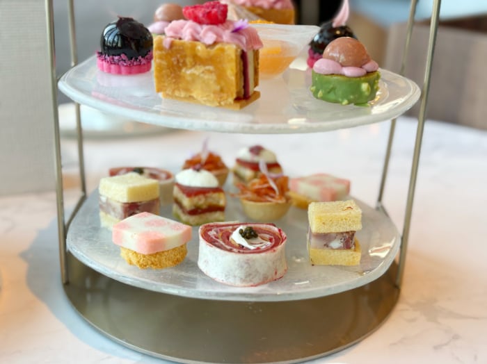 続けて運ばれてきたスタンドには、ピンクを基調にしたスイーツが並び、思わず写真を撮りたくなるかわいさ。