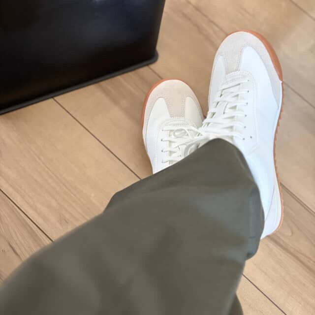 秋らしいモードな空気をまとわせてくれるのが、薄底&スマートなシルエットが特徴のローテクスニーカー。ユニクロシーの「スウェードコンビネーションスニーカー」は、合皮とスエードの組み合わせが上品で、大人のワードローブにしっくりなじみます。