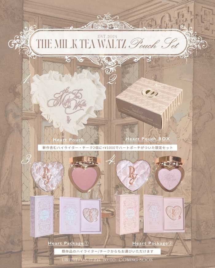 発売を記念して、限定セットやノベルティも見逃せません。「THE MILKTEA WALTZ POUCH SET」は、お好きなハイライター・チーク2点を選ぶと、ホイップのような質感が可愛いハートポーチがセットに。
