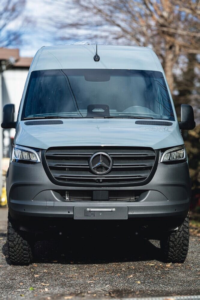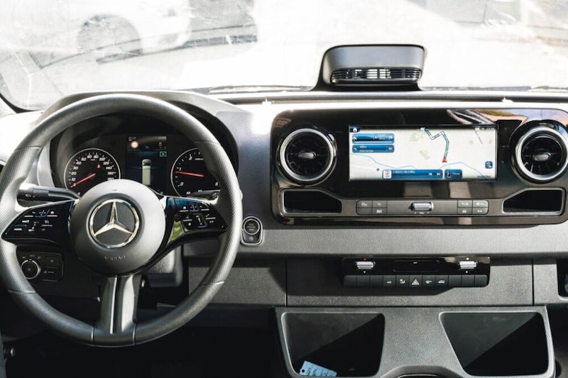 運転席回りは、カーゴバンと思えないほどモダンな印象を受ける。ディストロニック(アダプティブクルーズコントロール)やレーンキーピングアシストなどの安全走行システムも充実しており、高速道路での安定性も抜群。純正カーナビをインストール。