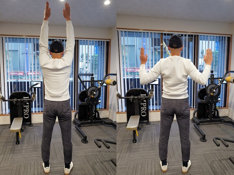 肩甲骨を意識しながら両腕を伸ばして、次に肘を曲げながら降ろします。これを10回ずつ行います。肩まわりを動かすことで、長時間同じ姿勢で固まりやすい上半身のリフレッシュにつながります。