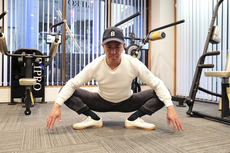 足を大きく開いて腰を落とす「股割り」の姿勢になります。両肘で両膝を外側に広げるように押し当てながらお尻を落とし、体を軽く上下させて小刻みに揺らしていきます。これを30秒ほど続けます。股関節周りがしっかりと伸びて、下半身の血流が促進されます。